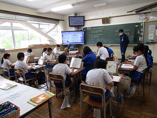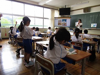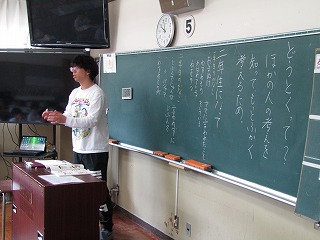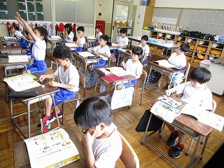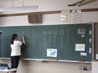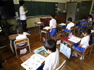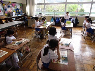 今日の天気はあまり良くなく朝は少し雨がぱらついていたようですが、先生と子どもたちが元気よくサッカーをして遊んでいました。まずは2限目。1年生から。知徳体の徳、道徳の時間です。