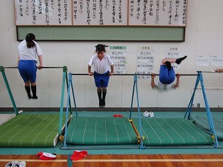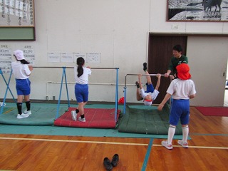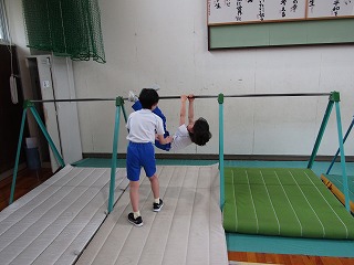 4年生は体育で鉄棒をしています。