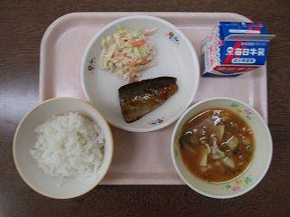 さて、今日の給食はご飯、鯖の味噌煮、切り干し大根のごまマヨ和え、春野菜の豚汁、牛乳でした。今日の豚汁は春キャベツに筍、春の季節を感じさせる具材の風味や食感がアクセントになって一段上のおいしさです。切り干し大根もごまマヨで食べ応えがあって子どもたちも喜ぶ味わいになっています。そして、最近話題の「鯖」でした。今日もとてもおいしかったです。給食調理員さん、生産者の皆さん、ごちそうさまでした。いつもありがとうございます。