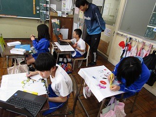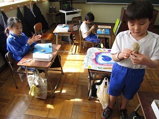3限目です。2年生は図工で、作品バッグができた子は・・・