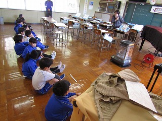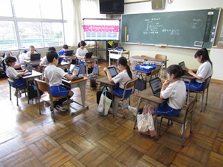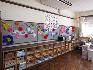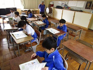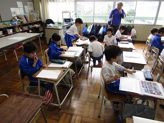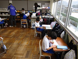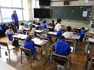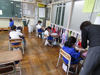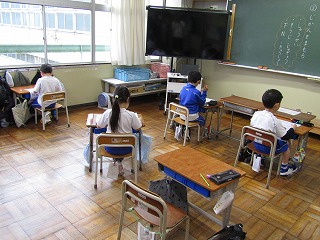 1年生は学活ですね。前の方でデスクケースの中身がこぼれてしまった子がいて2人の子がお手伝いして直しています。