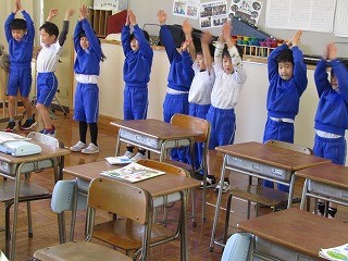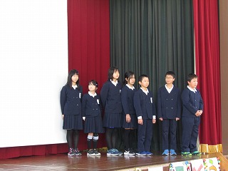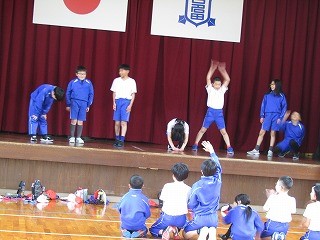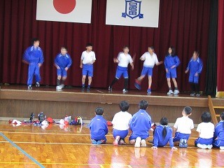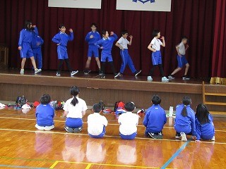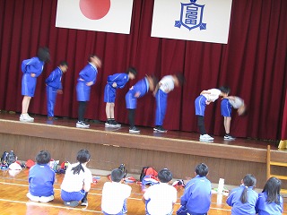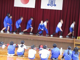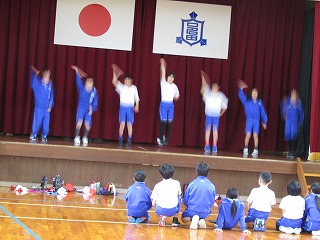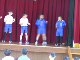 1年生から順番に発表していきます。1年生は音楽の時間に練習した、はるなつあきふゆのうた。かわいい振り付けに6年生達はニコニコしています。そのあとメダルを贈りました。