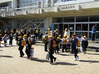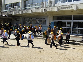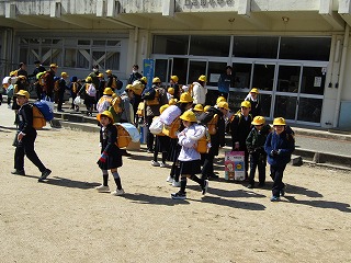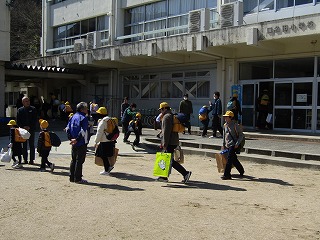 学活を終えた6年生達が涙を拭きながら集まってきました。渡り廊下で待っていた1年生達が6年生の手を引いて入場。
