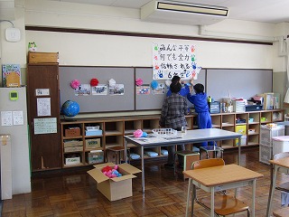 色んな掲示物を剥がしたり、小黒板をきれいにしたりしています。