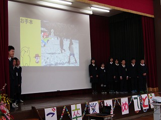 4年生はスライドで写真を紹介しながら6年生達との思い出を振り返りました。そして、替え歌で6年生へのお礼の気持ちとエールを贈りました。それから最後に自作のプレゼントを渡しました。