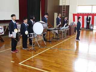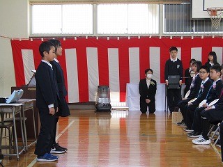 3年生はこげよマイケルの替え歌で6年生達の思い出を歌っていきます。歌詞作りに苦労がうかがえます。どこか寂しさもある曲なので涙も誘います。そのあと、自作のプレゼントを贈りました。