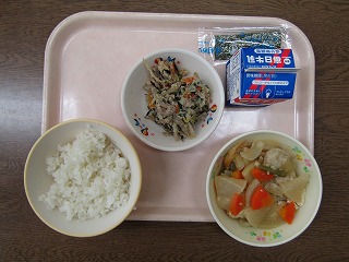 さて、今日の給食はご飯、おからの炒り煮、鰆のつみれと大根の煮物、味付け海苔、牛乳でした。給食のおからは毎回具材は違うのですが市販のものより格段に上の味わい。今回は鶏肉のうまみとゴボウの触感、ねぎの風味が印象的でした。煮物は鰆のつみれから上品なうまみが出ています。玉ねぎの甘みもやさしいです。今日もとてもおいしかったです。生産者のみなさん、給食調理員さん、ごちそうさまでした。いつもありがとうございます。