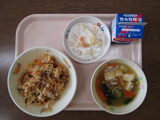 今日は給食が今年度最終日です。メニューはキムチチャーハン、春雨中華スープ、ヨーグルト和え、牛乳でした。チャーハンはキムチの酸味や少しの辛み、甘みが、具材と一緒になって食欲をかき立てます。ヨーグルト和えはフルーツたっぷりで子どもたちはすごくうれしかったと思います。給食調理員さん、生産者の皆さん、1年間毎日おいしい給食を本当にありがとうございました。おかげでみんな元気にぐんぐん成長することができました。ごちそうさまでした!