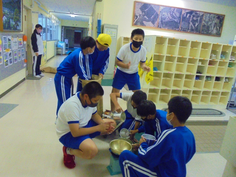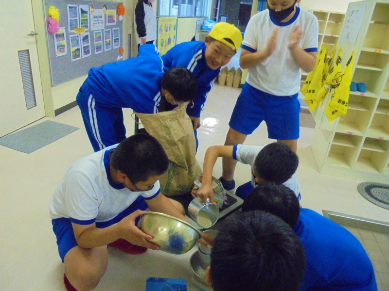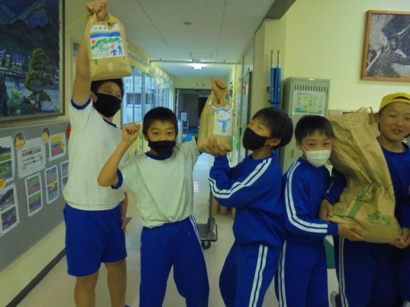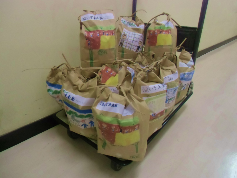 子どもたちが手作りした米袋を準備中。