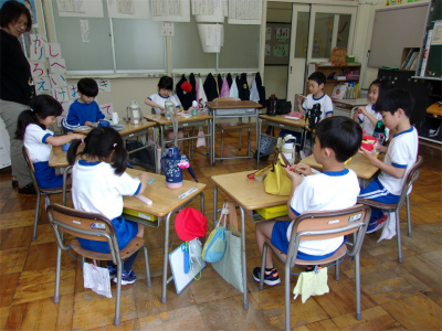 1年生は初めて学校でお弁当を食べます。「全部食べられるかなあ」と自分のお弁当を見て、心配する声もありました。
