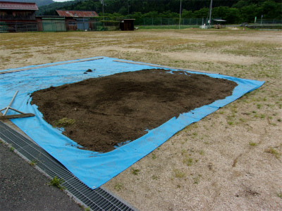 グラウンドの片隅では、プランター用の土を消毒しています。土は毎年大切に使い回しています。余った土は、以前ボランティアの方に耕していただいた畑で使われます。畑には近々野菜の苗を植える予定です。