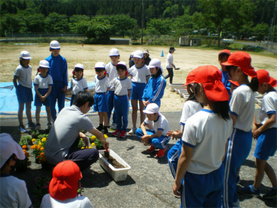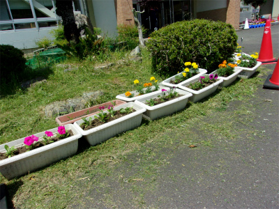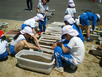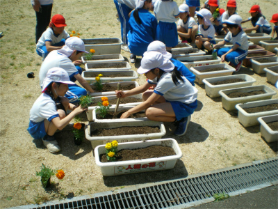 縦割り班ごとに、好きな花を植えていきます。ペチュニア、マリーゴールドはすでに花を咲かせています。