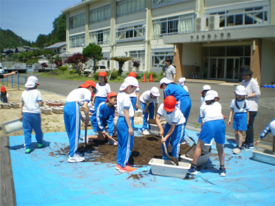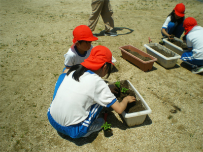 高学年が中心となって、プランターに土を入れます。この日のために土には栄養がたっぷり詰まっています。