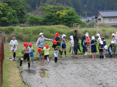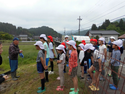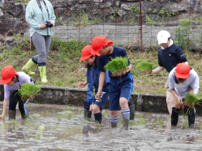 5/21 地域の方の協力を得て、全校での田植え体験です。天気は細かい雨模様。