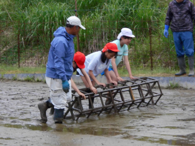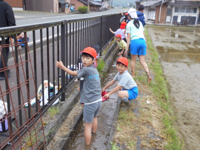 目印がついた田んぼにグループごとに入っていきます。初めは恐る恐る足を田んぼの中に入れていましたが、思ったより田んぼの中は冷たくなかったようです。