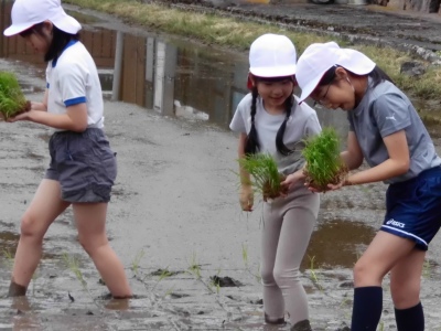 昨年も体験している学年の子どもたちは、3本ずつくらいの束にして、苗を田んぼの中に差し込んでいきます。