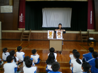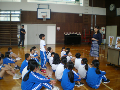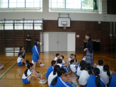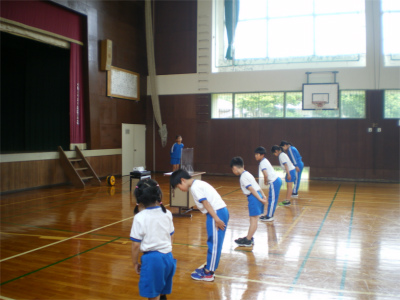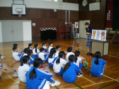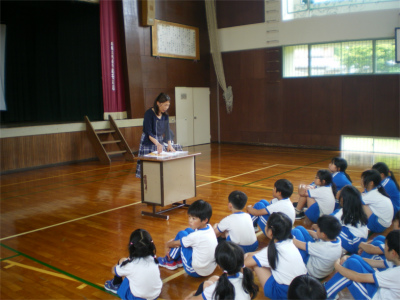 4/23 木曜日の午後は、のびのびタイムです。全校遊びや作文発表など年間の予定が組まれており、今日は校長先生のお話の時間です。しっかりお辞儀をして会は始まります。