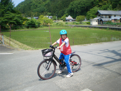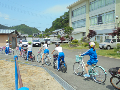 自転車を停止させ、安全確認中です。安全教室を終えての感想として、安全確認の大切さ、ブレーキの正しいかけ方、ヘルメットの正しいかぶり方、そして横断歩道を渡るときの挙手・会釈について、学んだことを漏らさず発表してくれました。