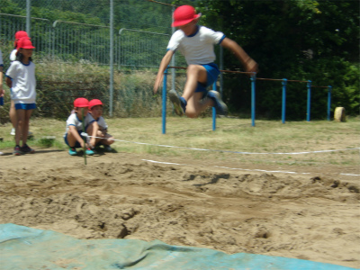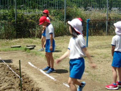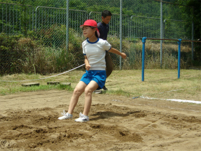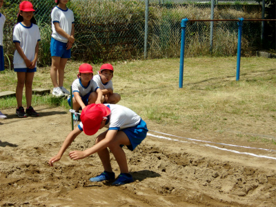 6月の梅雨前に、グラウンドでの体育の授業が増えてきました。3~6年生は今年初めての幅跳びです。「ここから踏み切るんだよ」ということで、実際には踏切線に立ってみます。