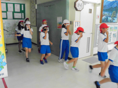 6/27 避難訓練をしました。初めは地震が起きた想定です。緊急地震速報を聞いた後、各教室で机の下に入って身を守ります。その後、給食室で火災が起きたという放送の後、みんなは先生を先頭にグラウンドに避難しました。