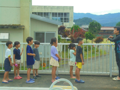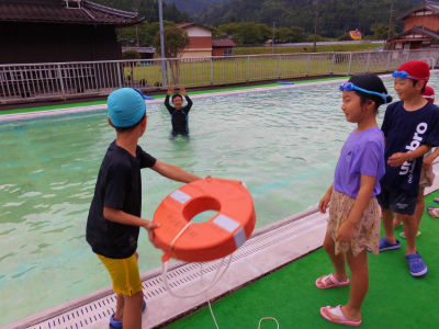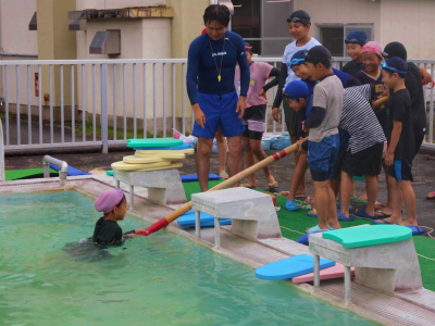 溺れた人がいた場合の練習です。身近にあるもので助けます。決して自分から助けに行かないことが重要です。夏休みも間近になりました。川や海、プールでの遊びの際は、大人の人を含め、必ず複数の人で遊ぶようにしましょう。