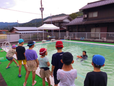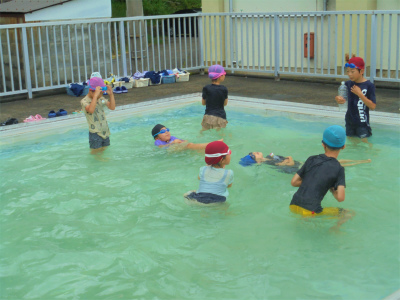 中高学年の学習では、まず小プールに入って、人工的に水の流れを作ります。その後、止まった時にどのくらい水の抵抗があるかを感じ取ります。