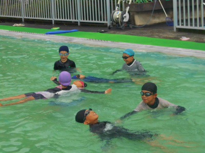 7/10 プール学習では、非常に重要な着衣泳の学習です。低学年からスタートしました。