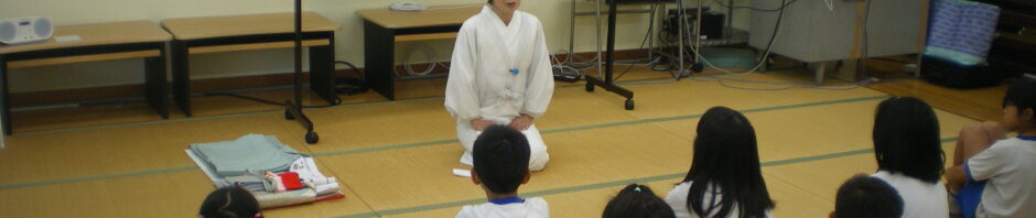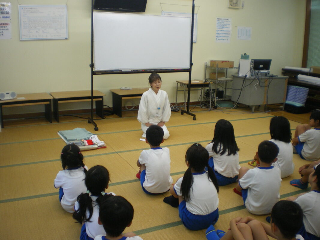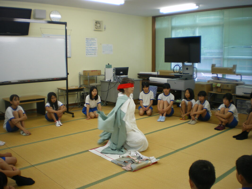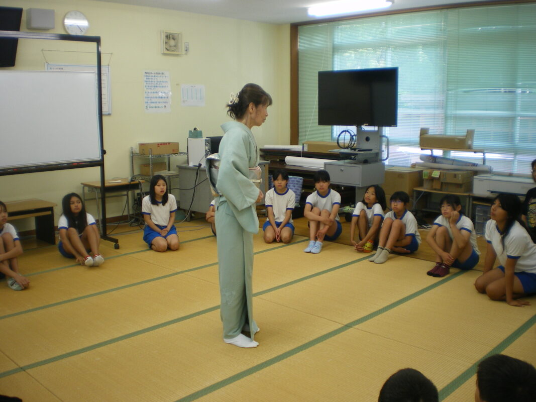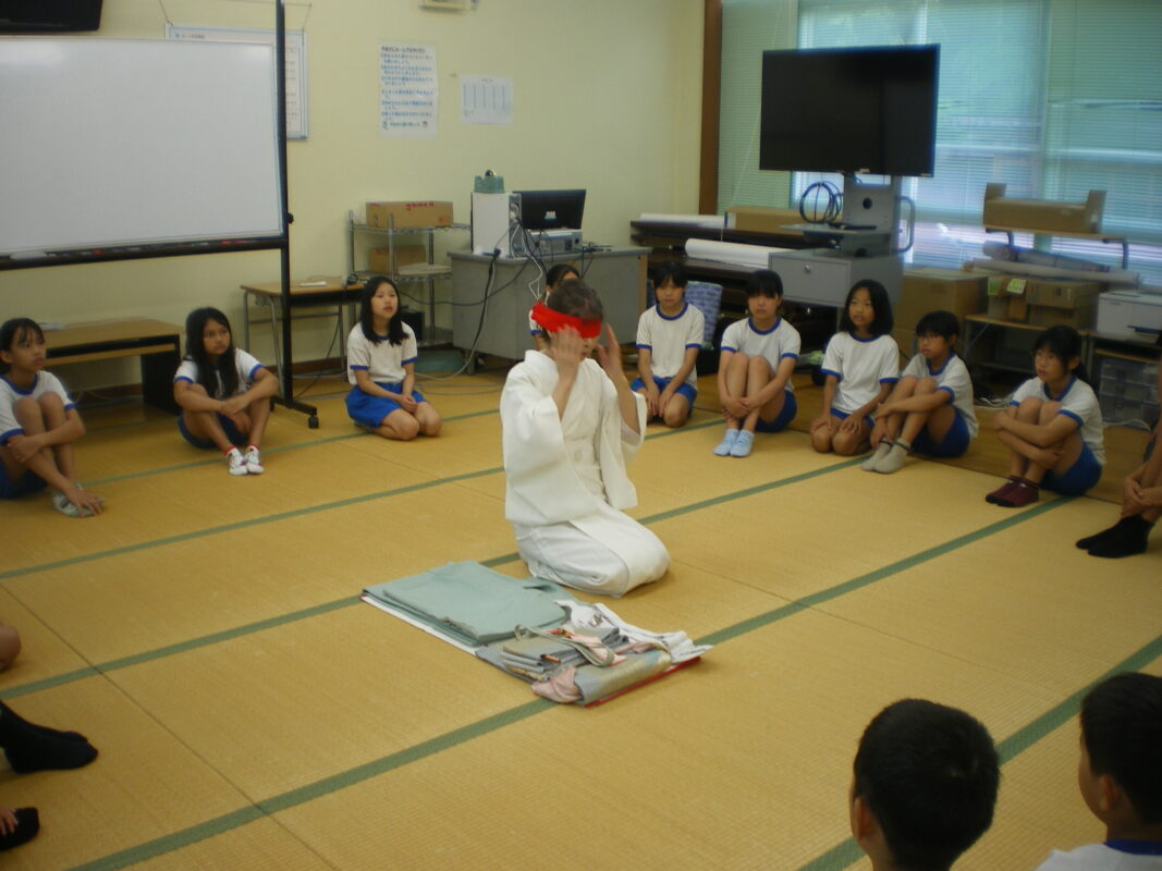 本日、競技着付の様子を見させていただきました。本校職員が、毎年競技着付の全国大会に出場しており、日々着付技術の向上に励んでおられます。このたび、ぜひ、子どもたちにも、日本の伝統文化でもある着物や着付について興味をもってもらいたいという思いから、この催しが実現しました。