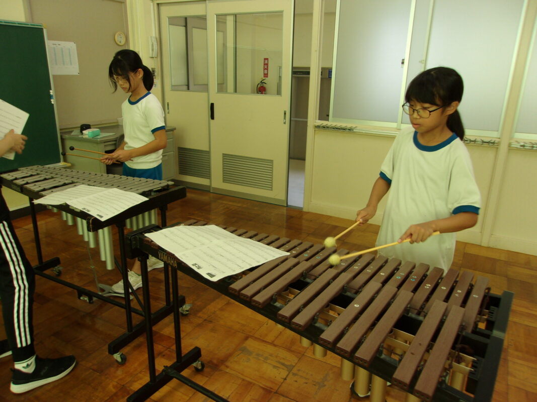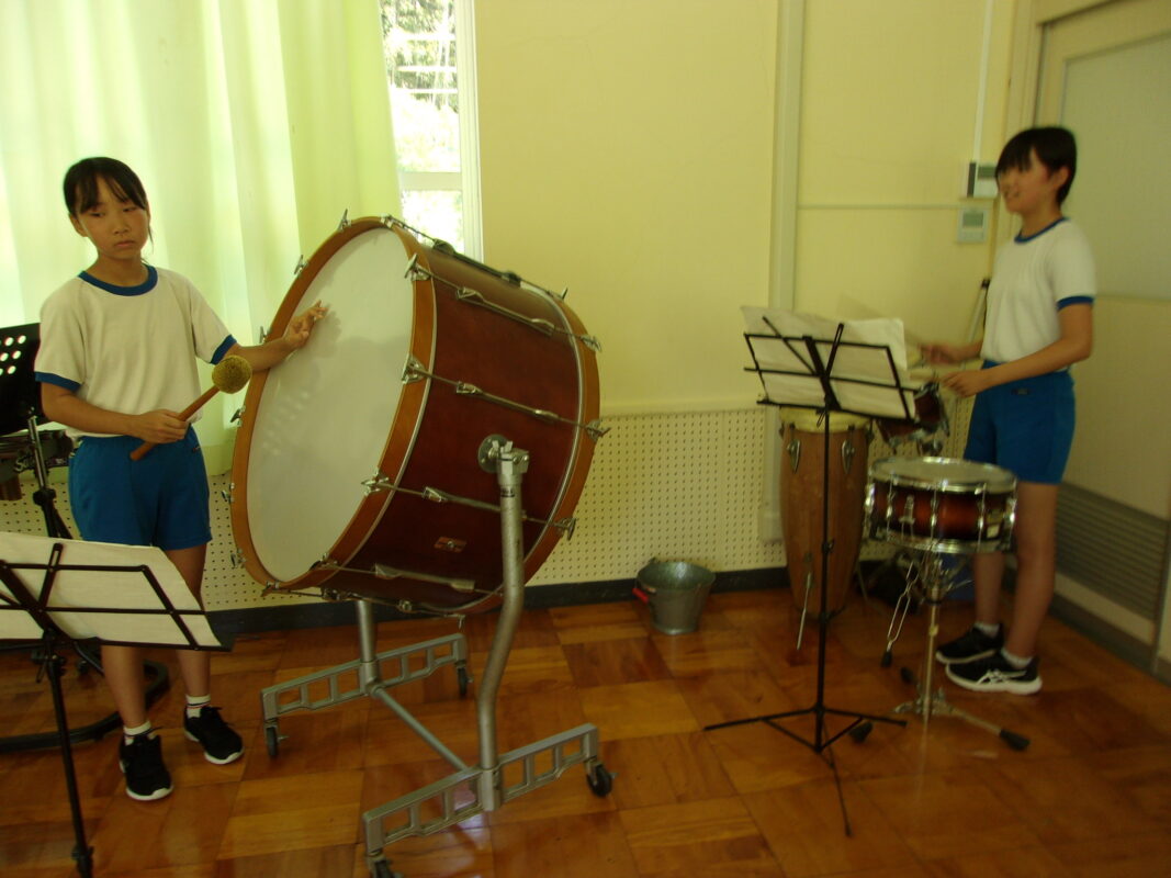 打楽器は、合奏する上でみんなの音を支え、引っ張る大事な役目があります。指揮に合わせて一定の早さで演奏します。二人で声を掛け合いながら練習していました。