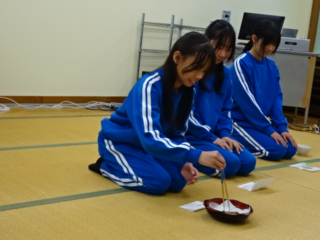 最初はお菓子のいただき方からです。今回は「桜餅」と「うぐいす餅」の2種類のお菓子が用意されました。みんな懐紙を広げて、お菓子を箸で取り分けます。