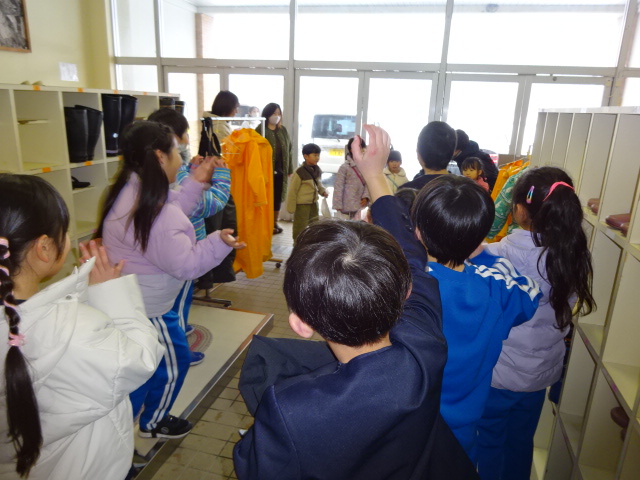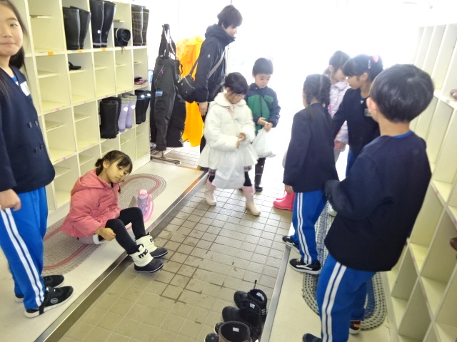 10時20分、低学年の8名が玄関でお迎えします。あいにくの雪でしたが、無事全員がそろいました。