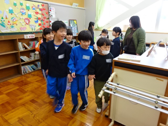 控え室の図書室から、低学年の教室に移動します。どちらも、ちょっぴり緊張した様子です。