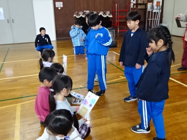 少しずつみんなの緊張もとけてきた頃、1年生が作ったクイズを1人一問ずつ出しました。「園庭」という答えのクイズでは、「えんてい」という言葉を知らなかったので答えに行き着きませんでした。1年生になって獲得した言葉なのかもしれません。