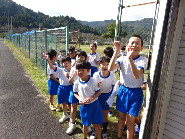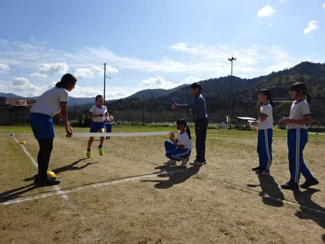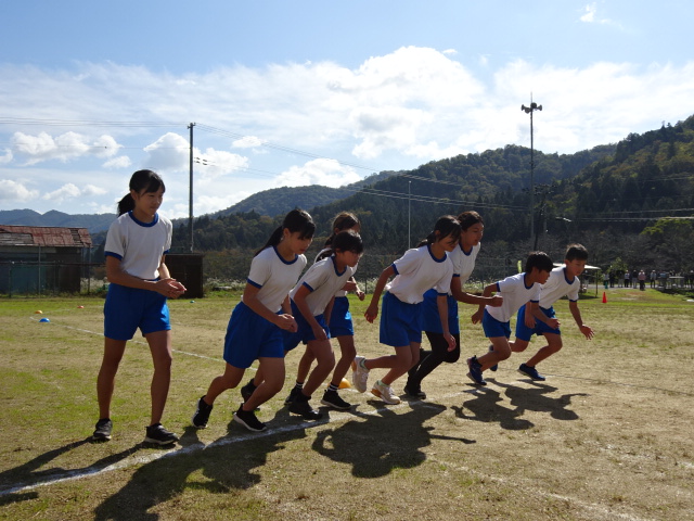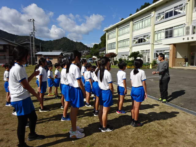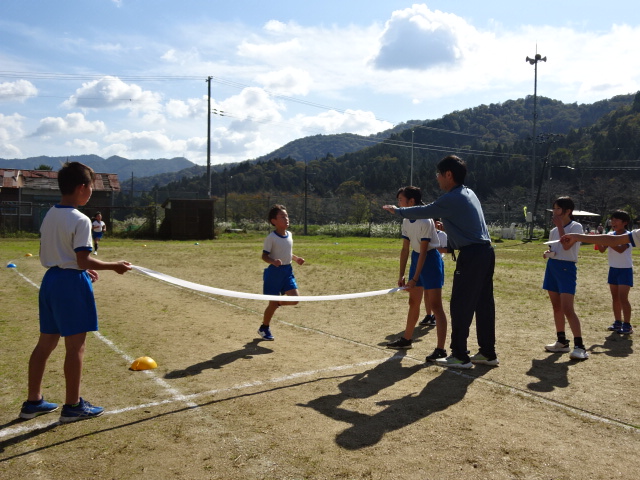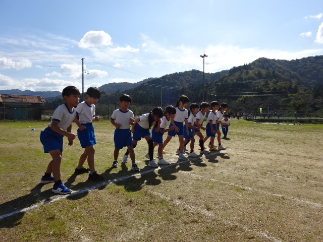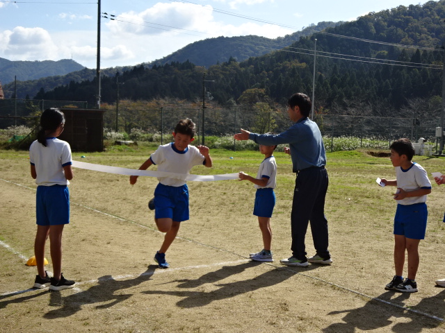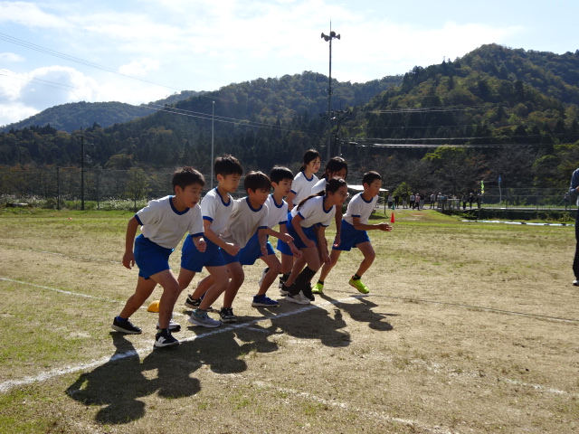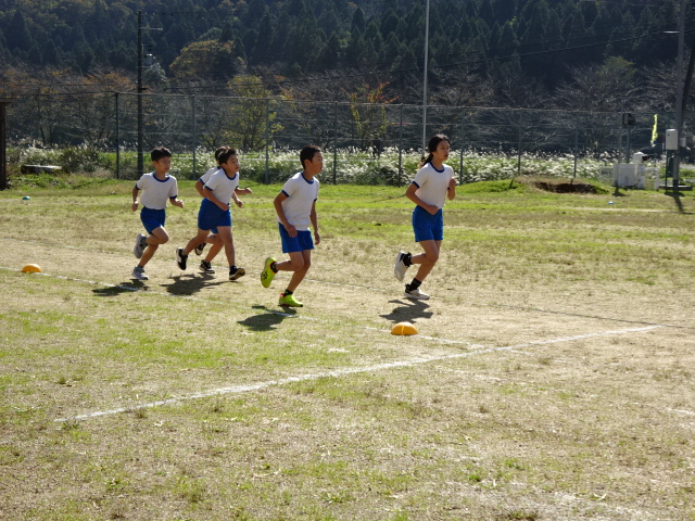 10/29 マラソン大会が開かれました。中、低、高学年の順でスタートするので、まず中学年が準備運動としてトラックを3周軽く走ります。