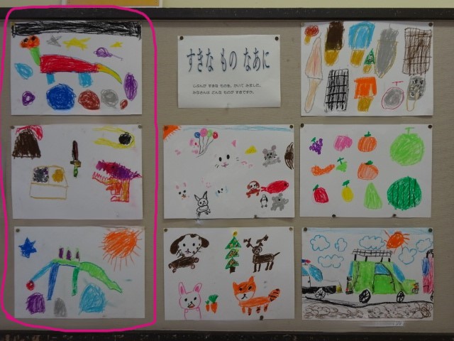 廊下には、低学年の8名が描いた絵が掲示されています。ピンクで囲まれた3点が1年生の作品です。楽しそうな絵です。