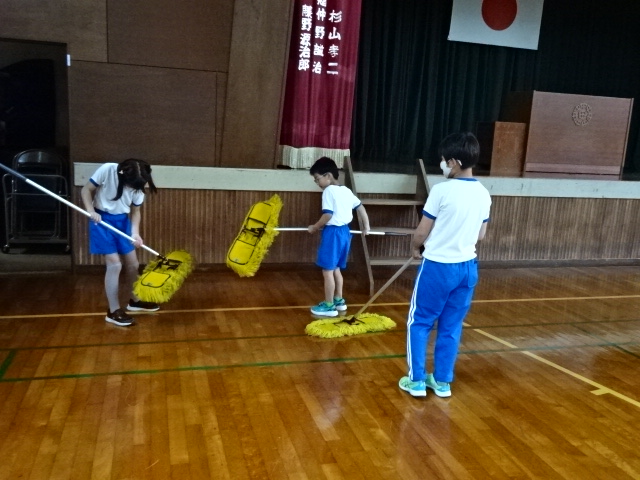 大きな学校を25人で掃除をするので、体育館には3人しかいません。それでもモップで隅々まで掃除します。1年生も入っています。