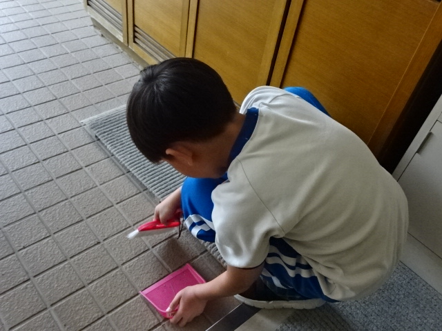 玄関にはズックについてきた砂がたまりやすいので、タイルの目地に沿って砂を掻き出します。