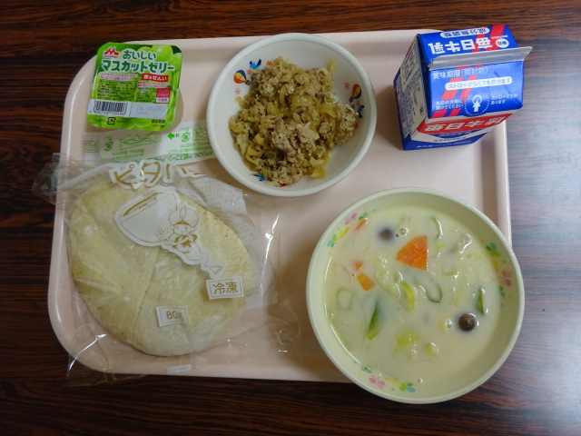 4/27 本日の給食は、調理員さんが考案したメニューです。ピタパンの焼き肉サンド・和風クリームスープ・マスカットゼリー・牛乳です。