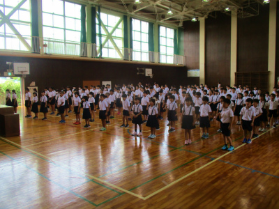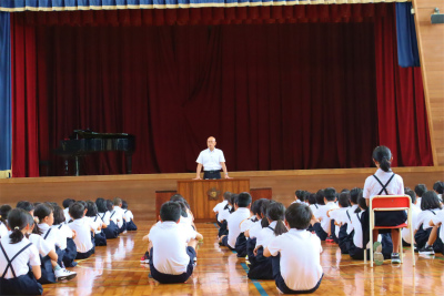 始業式では、40日の長い休み中、○○車のお世話になる人がいなくて安心したこと、まだ暑い日が続くが水分を補給し熱中症を予防すること、行事や学習活動で自分の伸びを実感できるように目標を持って取り組んでほしいことなどを伝えました。