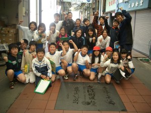 その後、バスで出町商店街にむかい、到着セレモニーをおこないました。商店街のみなさんにお祝いしていただきながらくす玉を割り、みんなで万歳三唱をしました。