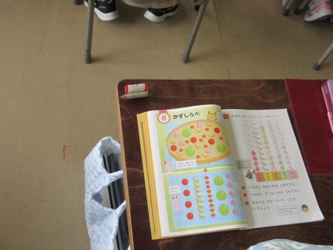「かずしらべ」でそれぞれの数を整理してくらべる学習です。これはやがて棒グラフなどの学習につながります。「どうして下から色をぬるのかな?」「バナナはリンゴよりいくつ多いのかな?」「どうして絵の中の吾5と6の間に点線…が入っているのだろう?」そうしたことをじっくりと考えていました。