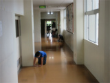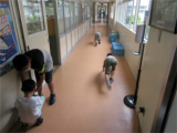 朝一で掃除。班長さんの言うことを聞きながら職員室前や廊下を元気に雑巾がけしていました。