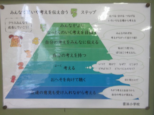 そんな社会を生き抜くために、子ども達には思いや考えを伝え合う力をつけてもらいたい。そんな願いのもと学校で5つのステップを考え、全ての学年学級で取り組んでいくことにしました。