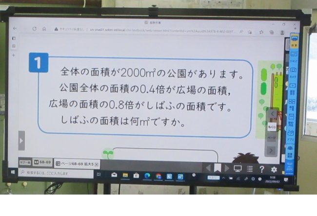 5年生の教室におじゃましました。小数倍についての算数の学習でした。さて、問題を見てお気づきだと思いますが、問題の横の絵が隠れています。教科書ではよく問題で聞かれていることをイメージしやすくするようにヒントとなる絵や図が掲載されています。それを見るとおのずと問題が解きやすくなるものです。