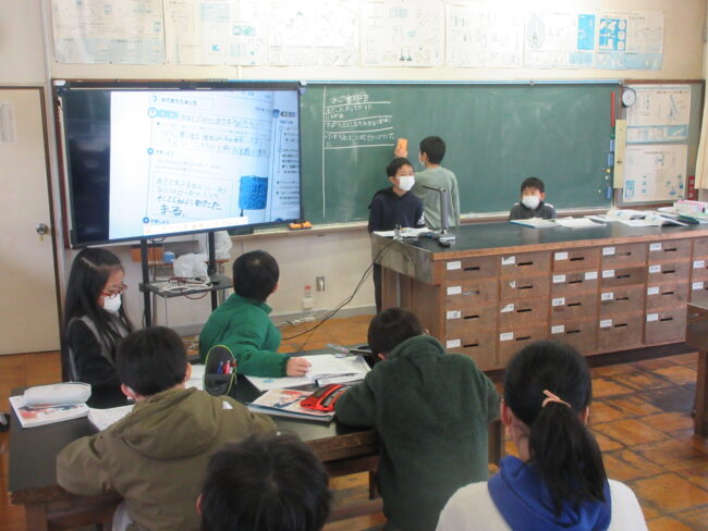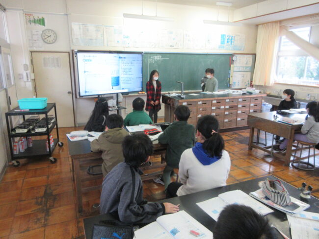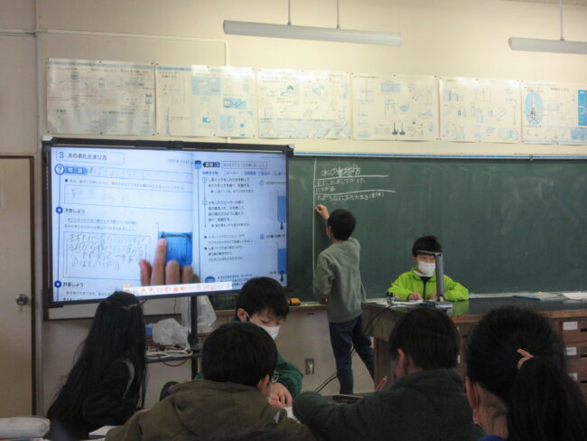 2限目は4年生が理科室で理科の学習。今日は水の温まり方についてです。