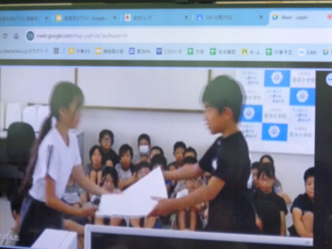 来る16,17日に田烏の海で200m全員完泳を目指す『海チャレンジ』に挑戦する5年生。今日14日、リモート集会を行い、5年生が決意を語りました。また、昨年経験した6年生からは大きなエールをもらいました。 全校から応援メッセージも受け取り、自分たちの目標達成はもちろん、みんなの熱い声援にも応えたいと意欲を高める5年生たち。 これまで一人一人それぞれの目標を持って練習をしてきた5年生は、みんなで声をかけあって目標達成を目指してがんばります!