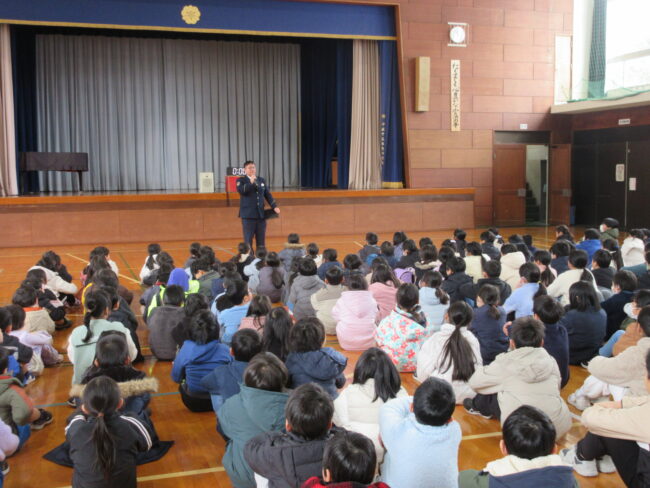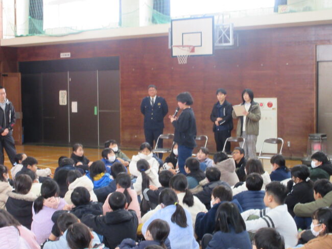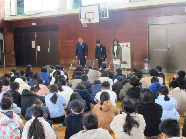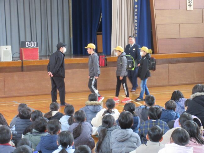 また、登下校時などに不審者と遭遇したときの注意すべきこと、対処の仕方についても警察署の方からお話がありました。自分の身は自分で守る!できるだけ冷静に対処できるよう、訓練の時間に「こういうことが起こるかもしれない」と想定しておくことが大切です。
