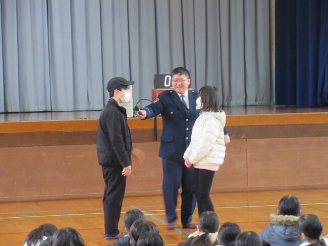 小浜警察署のご協力・ご指導のもと、「学校に不審者と思われる人が侵入し、気づいた職員が対応。子供たちは合い言葉の放送指示で対応」という想定で防犯訓練が行われました。