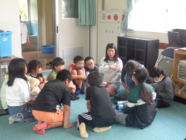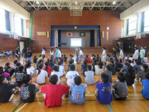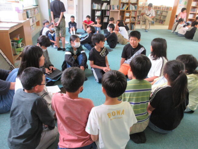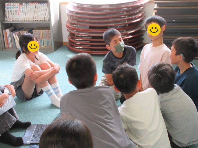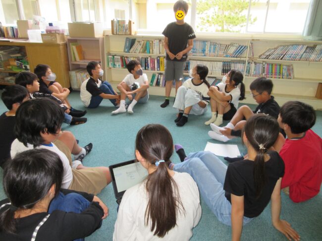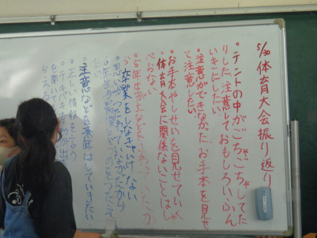 きちんとそろった上履きが並んでいる多目的ホールをのぞいてみると、5,6年生が体育大会の振り返りをもとにこれからの児童会行事などにどう活かしていくかなどを話し合っていました。