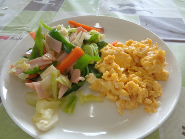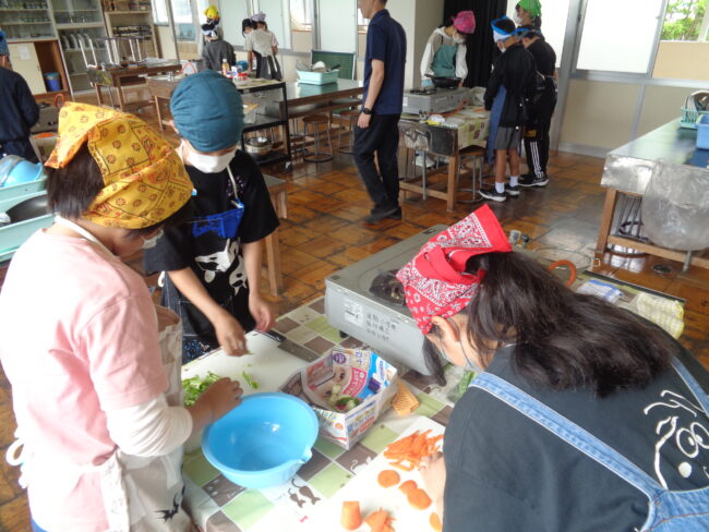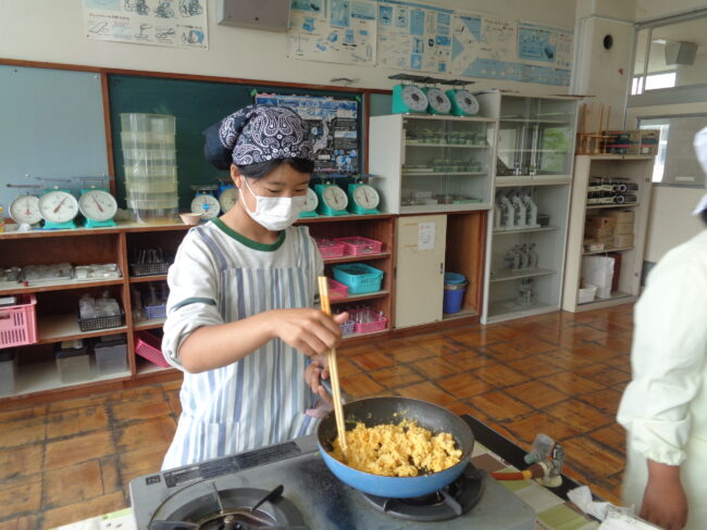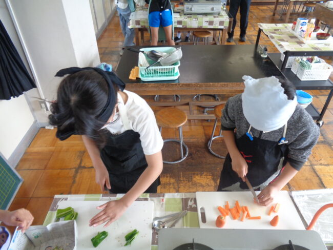 2、3限目には6年生が家庭科調理実習で栄養たっぷりの一皿を班で協力して作りあげていました。